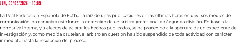 Este es el comunicado emitido por la RFEF: "La Real Federación Española de Fútbol, a raíz de unas publicaciones en las últimas horas en diversos medios de comunicación, ha conocido este lunes la detención de un árbitro profesional de Segunda división. En base a la normativa interna, y a efectos de aclarar los hechos publicados, se ha procedido a la apertura de un expediente de investigación y, como medida cautelar, el árbitro en cuestión ha sido suspendido de toda actividad con carácter inmediato hasta la resolución del proceso".