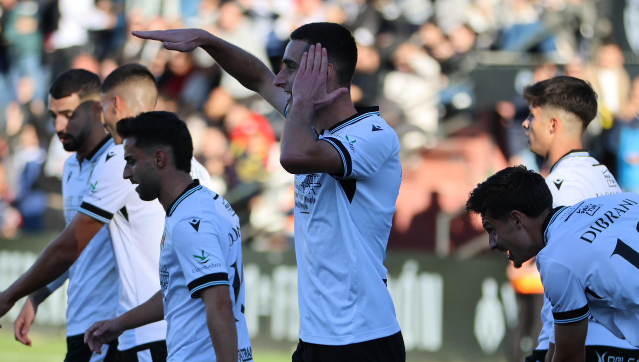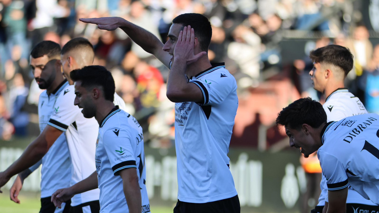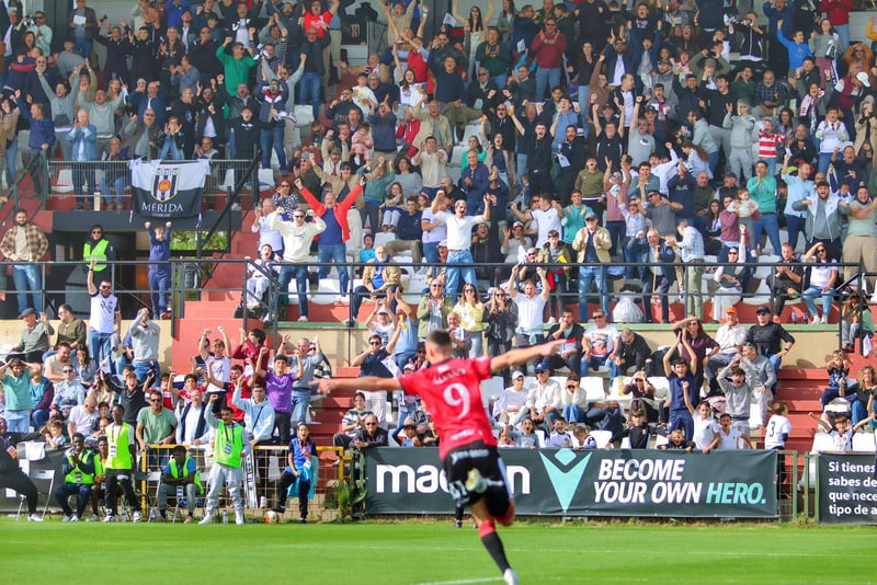 Álvaro García celebrando un gol esta temporada en Primera RFEF@Merida_AD