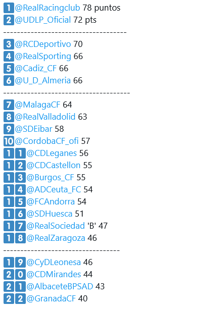 Uno de los beneficiados de esta mala racha del Racing de Santander es Las Palmas de Luis García, que ha conseguido igualar los actuales 38 puntos de los cántabros. Las Palmas sería el otro equipo que subiría a Primera de manera directa sumando 72 puntos al final de la liga regular.
