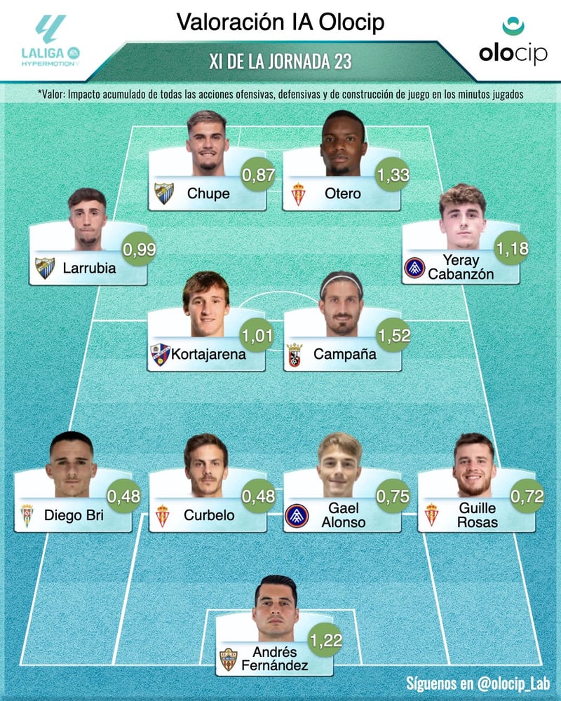 Por tanto, el once ideal de la jornada 23 elaborado por la Inteligencia Artificial de Olocip queda conformado por: Andrés Fernández (Almería), Curbelo (Sporting de Gijón), Gael Alonso (Andorra), Guille Rosas (Sporting de Gijón), Diego Bri (Córdoba), Kortajarena (Huesca), Campaña (Ceuta), Yeray Cabanzón (Andorra), Larrubia (Málaga), Chupe (Málaga) y Otero (Sporting de Gijón).