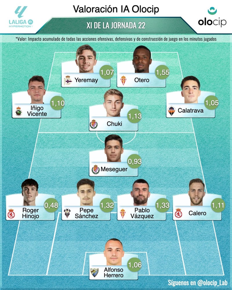 Desde Olocip, empresa especializada en IA de la que es su CEO el ex futbolista Esteban Granero, han lanzado el once ideal de la última jornada de LaLiga Hypermotion en la que aparecen futbolista como Yeremay Hernández o Iñigo Vicente