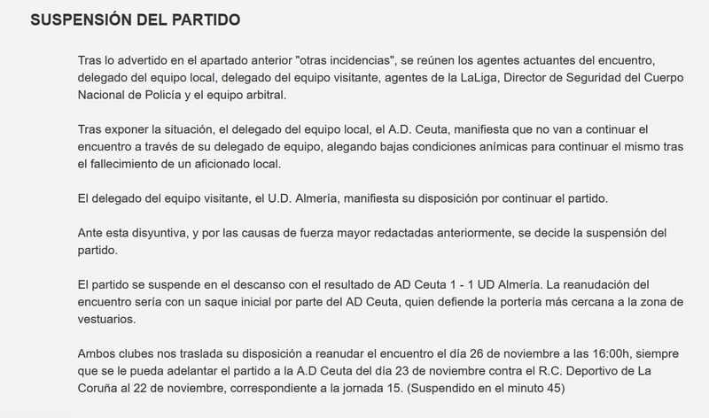 En el propio acta del colegiado Alejandro Morilla Turrión, se recoge la idea de Ceuta y Almería de que el choque se reanude el 26 de noviembre a las 16:00 horas y tal y como informamos en ESTADIO Deportivo, "siempre que se le pueda adelantar el partido al Ceuta del día 23 de noviembre contra el Deportivo de La Coruña al 22 de noviembre".