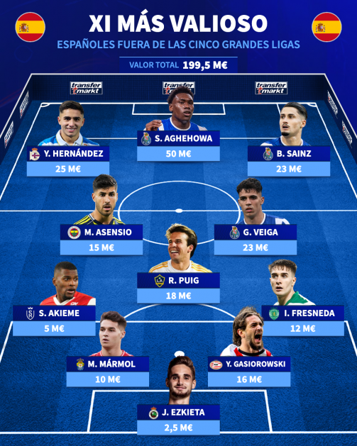 El once completo de jugadores españoles más valiosos fuera de las cinco grandes ligas