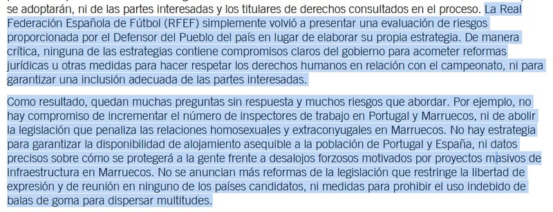 Respecto a la seriedad con que se ha tratado la parte de los derechos humanos en el proceso de presentación de candidaturas". Sobre los informes presentados por España, Marruecos y Portugal, Amnistía Internacional apunta a que "presentan graves deficiencias y omisiones". Sobre el informe presentado por la RFEF, Amnistía Internacional apunta lo siguiente: "Simplemente volvió a presentar una evaluación de riesgos proporcionada por el Defensor del Pueblo del país en lugar de elaborar su propia estrategia. De manera crítica, ninguna de las estrategias contiene compromisos claros del gobierno para acometer reformas jurídicas u otras medidas para hacer respetar los derechos humanos en relación con el campeonato, ni para garantizar una inclusión adecuada de las partes interesadas".