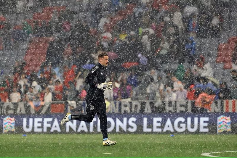Ya calientan los jugadores de Alemania y Portugal bajo un fuerte aguacero. En imagen: Ter Stegen.