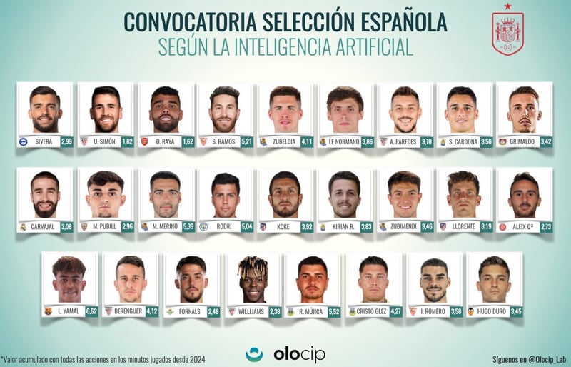 La IA ha querido jugar un papel especial para ayudar a Luis de la Fuente a la hora de confeccionar la lista de convocados para los próximos compromisos internacionales. Según los compañeros de Olocip, se salvan pocos de los fijos con los que contará el seleccionador y que con total seguridad estarán representando a La Roja. Cabe destacar que estos valores para elegir a los seleccionados se componen por el "valor acumulado con todas las acciones en los minutos jugadores de este 2024".