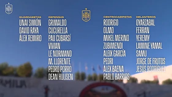 Delanteros: Lamine Yamal, Ferran Torres, Mikel Oyarzabal, Samu, De Frutos, Jesús Rodríguez, Yeremi Pino