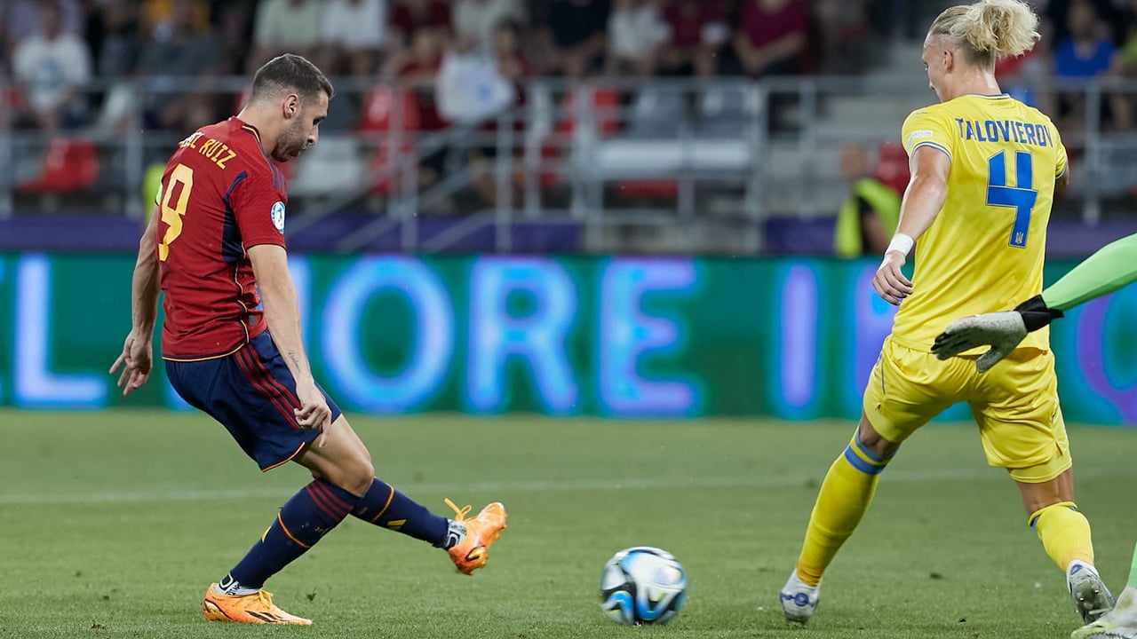 El partido comenzó con España intentando imprimir un ritmo alto para buscar un gol tempranero. La primera ocasión llegó del lado español con un disparo a la escuadra izquierda que rechazó a la perfección el portero ucraniano. España quería marcar pronto y en el minuto 11 llegó la segunda aunque está no acabó entre los tres palos. El bético Rodri se metía hacía dentro, se la daba a Abel Ruiz y este mandaba cruzado su disparo desde la derecha, rozó la base del poste.
