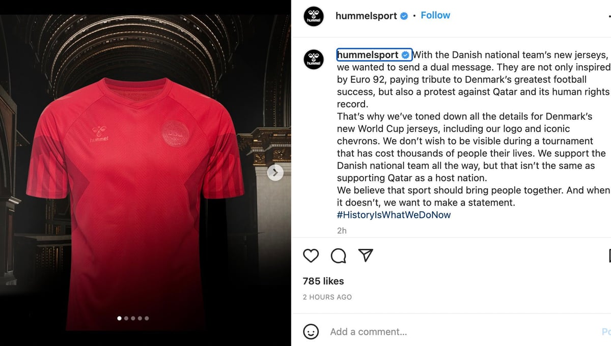 "Con las nuevas camisetas de la selección danesa hemos querido enviar un doble mensaje. No solo se inspiran en la Eurocopa 92, rindiendo homenaje al mayor éxito futbolístico de Dinamarca, sino que es también una protesta contra Catar y su historial con relación a los derechos humanos", explicó Hummel en sus perfiles en redes sociales.