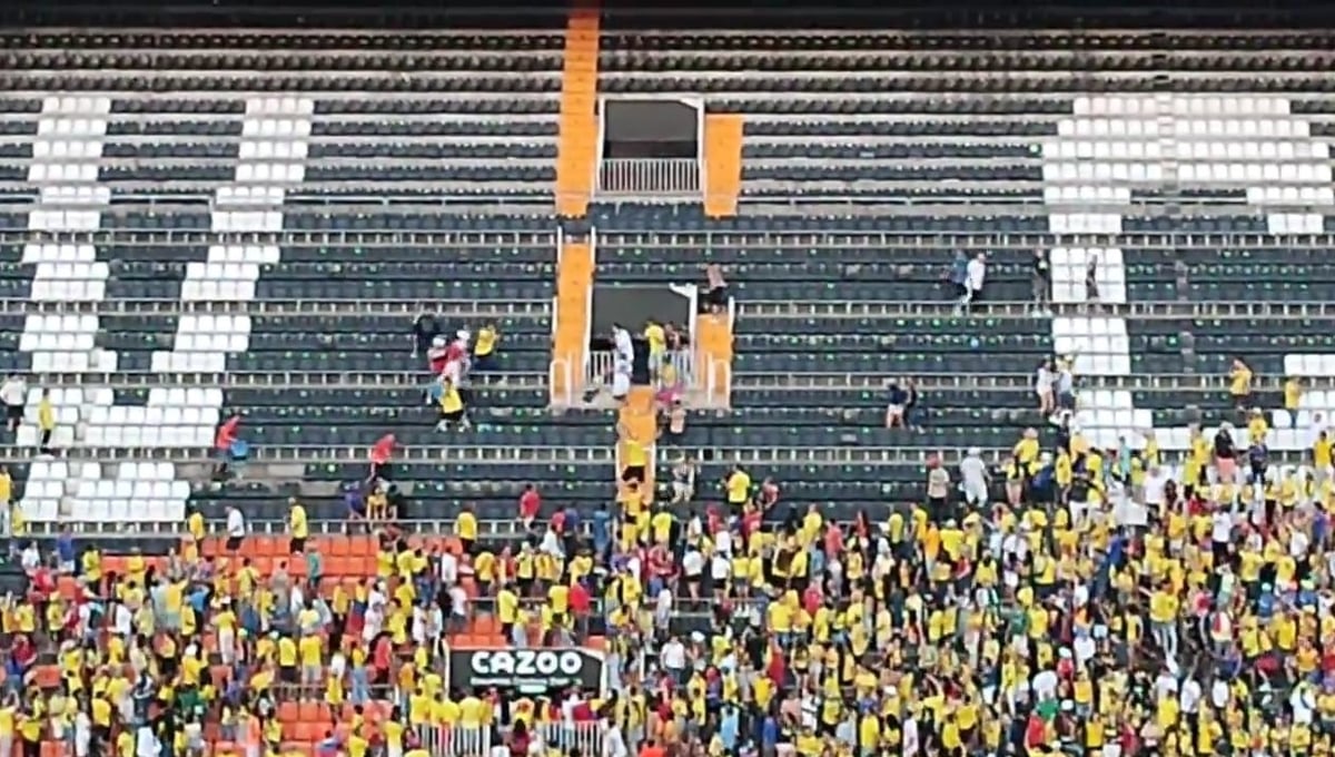 La seguridad presente en Mestalla tardo unos minutos en poder llegar y poner orden. Seguidamente, y mientras se seguían intentando golpear, expulsaron del campo a estos aficionados que según algunos testigos eran de diferentes equipos de Colombia y la trifulca pudo comenzar por ese motivo.