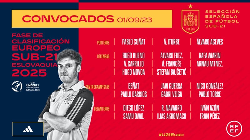 Esta primera convocatoria para jugadores nacidos a partir de 2002 no cuenta con Lamine Yamal, quien ha sido llamado por Luis de la Fuente para la selección absoluta. Sin embargo, diez futbolistas repiten su presencia en la sub-21 respecto al ciclo anterior. Hay varias caras nuevas, sobre todo varios nombres que están despuntando en nuestra liga.