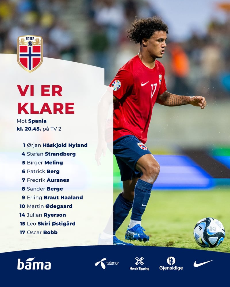 Por parte de Noruega ya hay también confirmación del once a falta de 1 hora para el arranque del encuentro: Nyland, el guardameta del Sevilla, defensa de 4 para Ryrson, Strandberg, Ostigard, Meling. Centro del campo Bobb, Berg, Berge y Aursnes. Arriba los goles los buscarán Odegaard y Haaland.