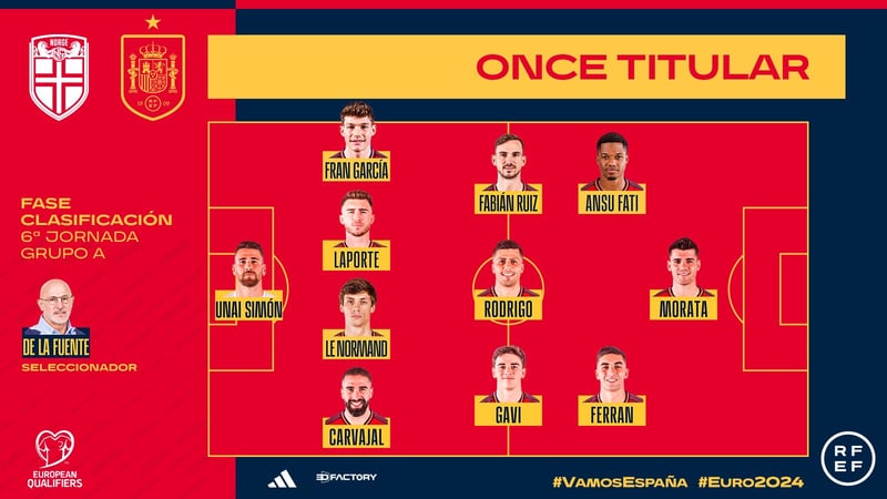 Luis de la Fuente jugará ante Noruega con el siguiente once. Unai Simón en portería, defensa para Laporte, Le Normand,, Fran García y Carvajal. Centro del campo para Rodrigo, Fabián, Gavi, Ansu Fati y Ferrán. El hombre referente en el ataque será Álvaro Morata.