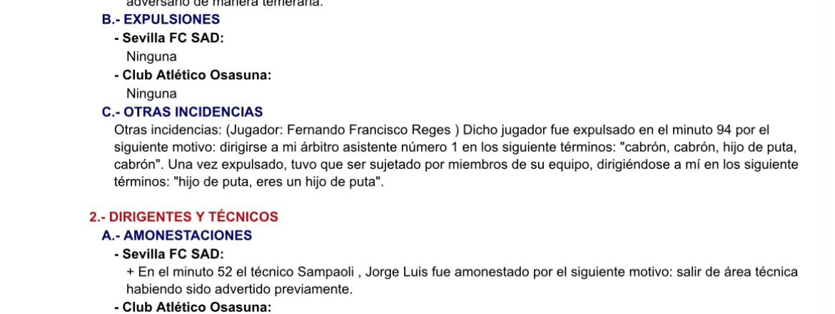 Las imágenes de televisión mostraron al ex de Oporto, Manchester City o Galatasaray fuera de sí, teniendo que ser sujetado y sacado de la zona técnica por compañeros, técnicos y algún empleado del club. Incluso, se le leyeron en los labios algunos insultos en perfecto castellano que el árbitro ha consignado en el acta, por lo que la salida de tono de Fernando le costará seguramente varios encuentros de sanción, además del ya seguro del próximo sábado 4 de marzo (21:00 horas) en el Metropolitano ante el Atlético de Madrid. De esta forma, el documento oficial que tendrán que intentar rebatir los servicios jurídicos del Sevilla FC desvela que el brasileño se dirigió primero al asistente número 1 para llamarle "cabrón, cabrón, hijo de puta, cabrón", reiterando su desconsideración grave hacia Pulido Santana cuando vio la roja: "Hijo de puta, eres un hijo de puta".