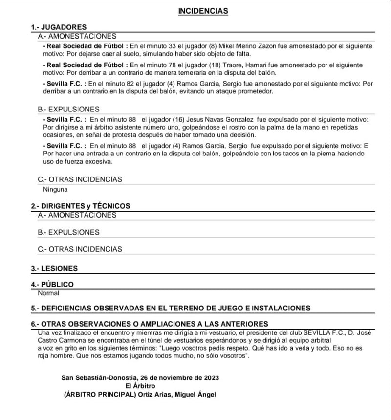 El colegiado madrileño expulsó a Sergio Ramos con roja directa tras revisión del VAR en el minuto 88 -antes lo había hecho por doble amarilla- y a esa roja siguió la de Jesús Navas tras un cruce de palabras con el árbitro que, tras ser detallado en el acta, puede costarle caro al capitán. Para rematar, recoge también un tenso incidente