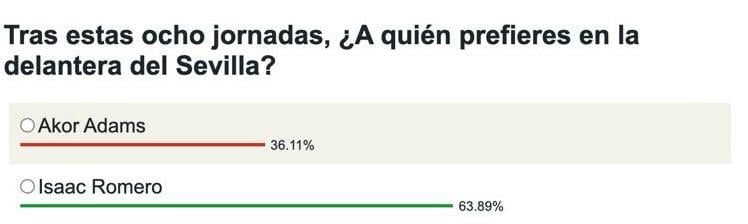 En Estadio Deportivo hemos querido preguntar a la afición del Sevilla por su preferencia para la titularidad en el conjunto nervionense y, aunque la decisión ha sido algo dividida, ha salido un claro ganador. El 63,89% de los votos optarían por Isaac Romero como delantero titular del conjunto sevillista. El 36,11% restante le darían la titularidad al nigeriano Akor Adams tras anotar en los dos últimos choques del Sevilla.