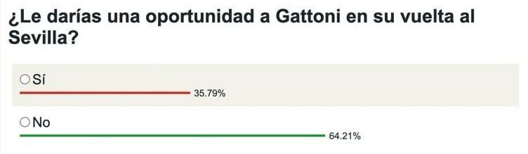 En ESTADIO Deportivo hemos querido conocer la opinión de la afición sevillista respecto a Gattoni y a una nueva oportunidad en el Sevilla. Como jugador nervionense, su único bagaje son cuatro partidos con un gol y varios despistes defensivos, como el que le costó la derrota en su debut ante el Valencia. El 64,21% de los votos no quieren la vuelta del central argentino al Sevilla y le buscarían una nueva salida. El 35,79% restante sí le darían una oportunidad para demostrar su valía con el nuevo cuerpo técnico.