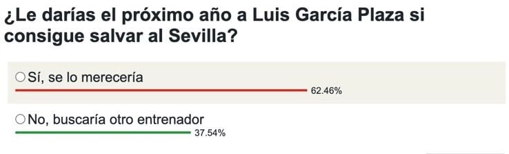 En ESTADIO Deportivo hemos querido testar la opinión del sevillismo con ese debate sobre el actual técnico nervionense. Los resultados han mostrado una cierta duda en cuanto a cuál sería la mejor decisión para el Sevilla FC, pero ha salido ganadora la opción de darle el nuevo proyecto a Luis García Plaza. El 62,46% de los votantes le darían ese año extra al madrileño como regalo por cumplir su objetivo mientras que el 37,54% restante no le darían el banquillo sevillista para la temporada 26/27.