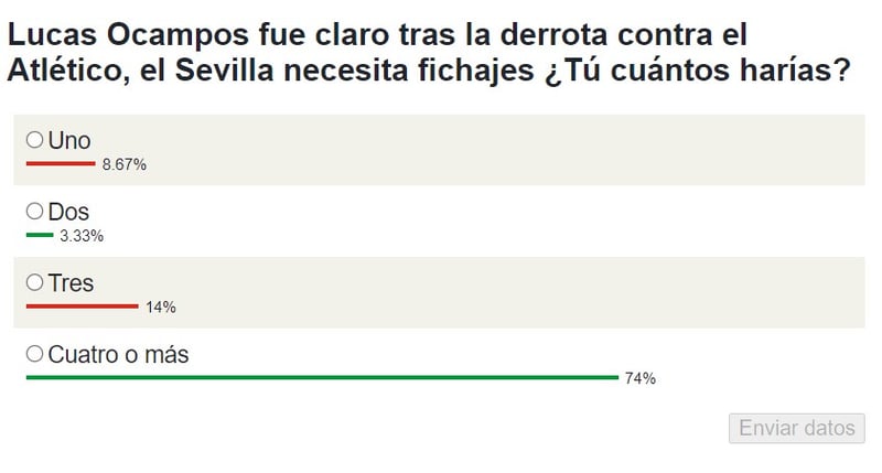 De este modo, los lectores de ESTADIO Deportivo están de acuerdo con las palabras de un Lucas Ocampos que pidió fichajes a la directiva del Sevilla. "Esperamos que en el mercado de invierno el equipo se pueda reforzar porque necesitamos 11 hombres en el campo y fuera de él. Necesitamos gente preparada y que todos estén disponibles", dijo el extremo argentino tras la derrota cosechada contra el Atlético de Madrid hace unos días.
