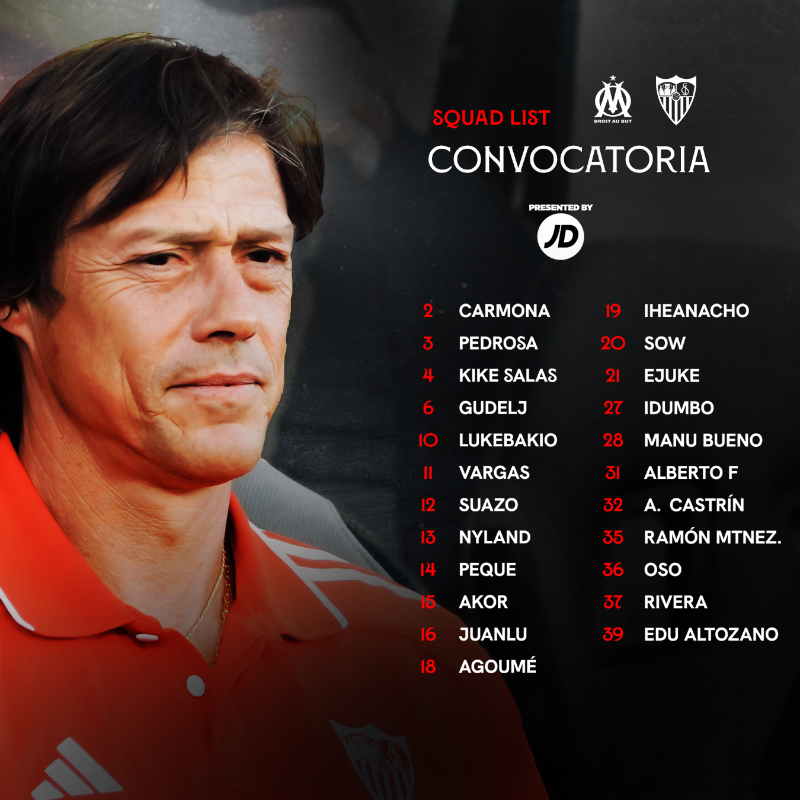 El entrenador del Sevilla FC ha ofrecido una lista de 23 expedicionarios a Marsella para medirse este sábado a partir de las 20:00 hora española con el Olympique. Los elegidos son los mismos que viajaron a Gelsenkirchen, salvo los lesionados Loïc Badé (con el sóleo de la pierna izquierda afectado) y Marcao Teixiera (con una sobrecarga en el cuádriceps izquierdo), que se unen a los de larga duración Tanguy Nianzou, Isaac Romero y Joan Jordán. Si el lebrijano comienza a ver la luz poco a poco tras su esguince de rodilla y se le espera la semana que viene, ya está recuperado Alfon González, aunque, con un solo entrenamiento a sus espaldas, seguirá trabajando en la Ciudad Deportiva José Ramón Cisneros Palacios para adquirir el ritmo que le llevan de ventaja en el grupo. Pero ni los problemas a última hora hacen cambiar de opinión a Matías Almeyda, firme con sus tres descartes principales.