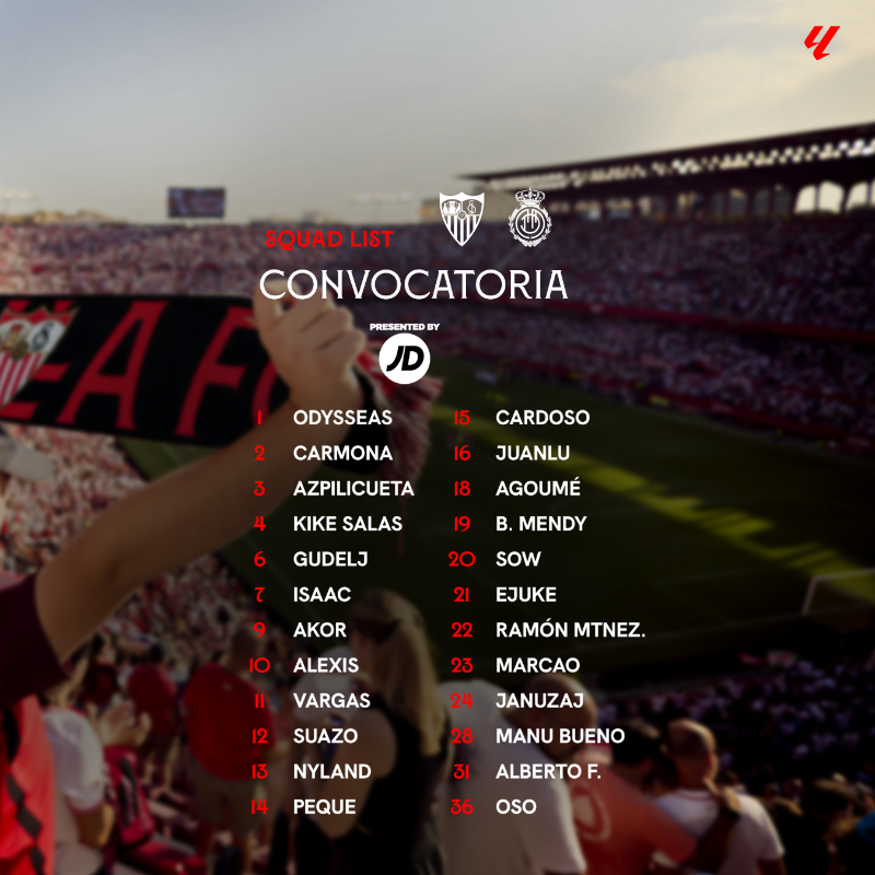 La nómina de citados para el primer compromiso tras el segundo parón de selecciones del curso es la conformada por: los guardametas Örjan Nyland, Odysseas Vlachodimos y Alberto Flores; los defensas José Ángel Carmona, Juanlu Sánchez, César Azpilicueta, Marcao Teixeira, Fábio Cardoso, Ramón Martínez, Kike Salas, Gabriel Suazo y Joaquín Martínez 'Oso'; los centrocampistas Nemanja Gudelj, Lucien Agoumé, Batista Mendy, Djibril Sow, Manu Bueno, Adnan Januzaj, Rubén Vargas, Chidera Ejuke y 'Peque' Fernández; así como los delanteros Alexis Sánchez, Isaac Romero y Akor Adams. El único apercibido de sanción, de forma sorprendente pues suele ser un recurso desde el banquillo, el Gerard Fernández, mientras que el pivote ex del Inter de Milán ha visto tres amarillas en el torneo doméstico y entraría en ese peligroso apartado de recibir otra ante los baleares.