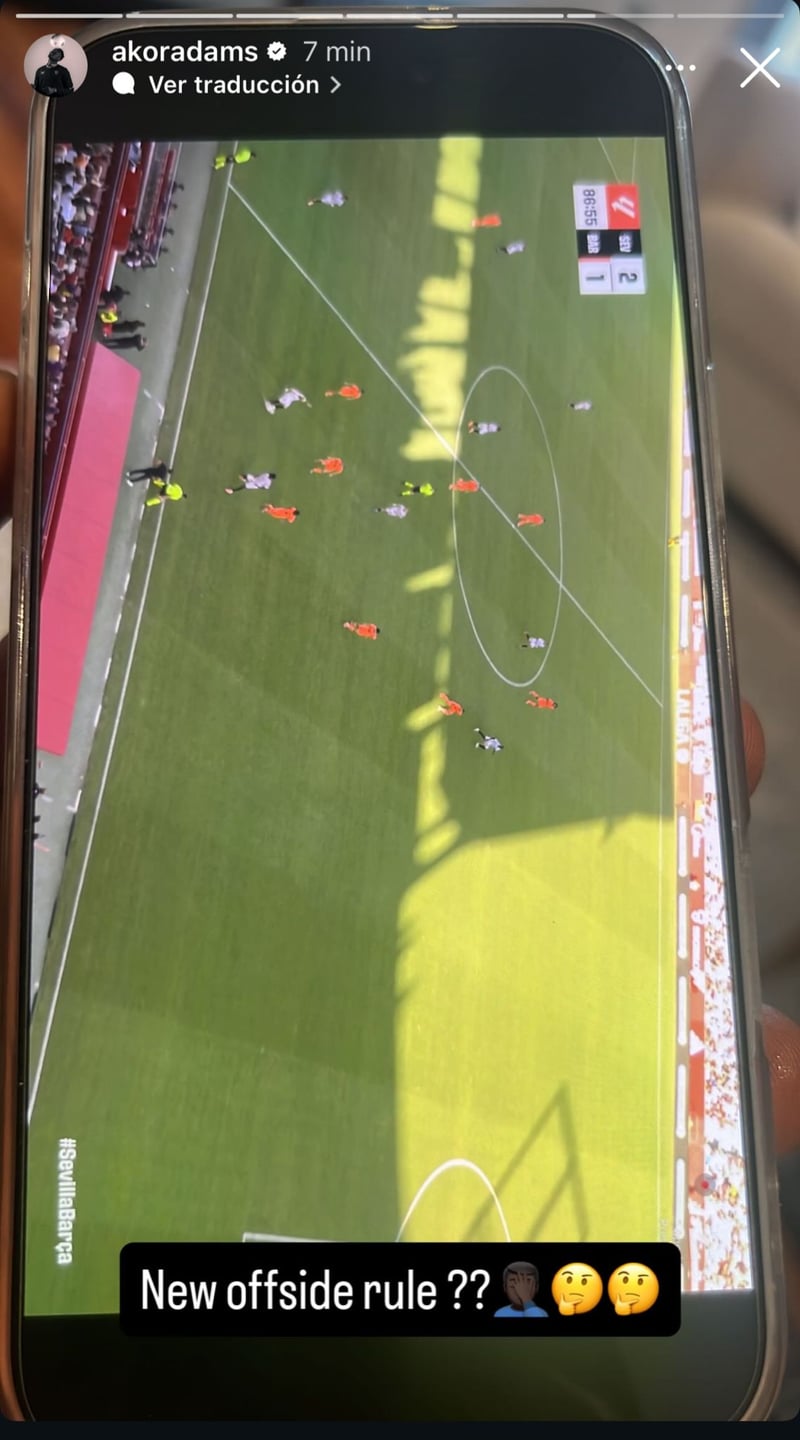 Ambicioso y orgulloso de su segundo tanto oficial como nervionense, el delantero africano tuvo un arrebato en redes sociales del que se arrepintió rápidamente, seguramente por que el 'feed back' que empezó a recibir en sus 'stoeries' de Instagram no era el deseado. "¿Nueva regla del fuera de juego?", se cuestionaba Akor Adams, junto a una captura del minuto 87 de su gol anulado que, en realidad, no apoyaba demasiado su argumento de que estaba en posición legal, por lo que optó por borrarlo. Además, el sistema semiautomático dictaminó que estaba adelantado y resulta difícil rebatirlo. Poco después, José Ángel Carmona y el propio ariete africano redondearon un póquer ante el Barça que ya resultó incontestable. Con todo, el '9' quiere más, está claro.