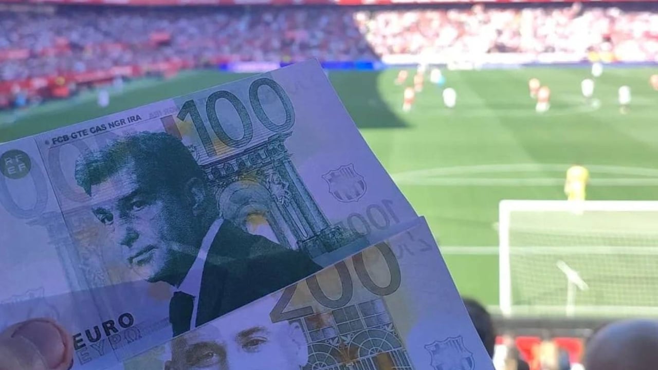 La afición sevillista lanzó billetes con la cara de Laporta y de Rubiales.R.S.