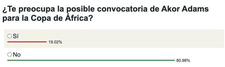 En Estadio Deportivo hemos querido preguntar a la afición del Sevilla por su nivel de preocupación con la posible convocatoria de Akor Adams en la Copa de África y la respuesta ha sido bastante clara. El 80,98% de los votos están tranquilos ante esa posibilidad mientras que al 19,02% restante sí le preocupa el hecho de perder al delantero durante varias semanas en ese tramo entre diciembre y enero, con la Copa del Rey también presente.
