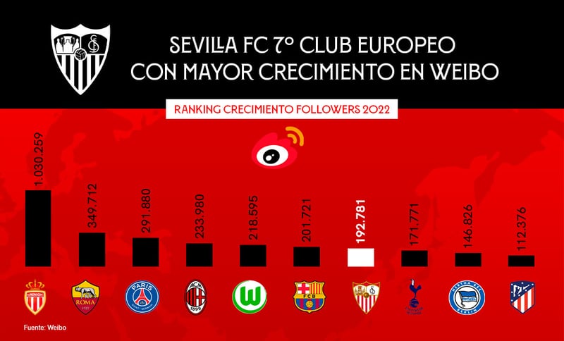 En la plataforma de micromensajería, el Sevilla FC han alcanzado los 843.000 seguidores, creciendo un 33 % con respecto a los datos con los que terminó el año 2021, y superando a 'rivales' con una fuerte implantación en China como el RCD Espanyol, propietarios de la empresa china Rastar Group, y que dispone solo de 332.000 seguidores. Además, la trascendencia lograda por los contenidos en Weibo alcanzó los 85 millones, un indicador que aumentó en un 238% interanual y que equipara en crecimiento al club andaluz en términos europeos con el Mónaco, la Roma, el PSG, el Milán y el Wolfsburgo.