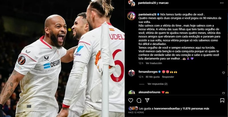 Pero no solo para el central del Sevilla fue un día especial, también para su familia, su mujer y sus hijas que han vivido y apoyado día a día a Marcao en su recuperación. Por eso mismo, su esposa quiso dejarle también un mensaje de ánimo, además de mostrar su orgullo, por todo lo que ha pasado esta temporada, desvelando también que el brasileño tuvo que pasar por el quirófano hasta en dos ocasiones durante estos meses.