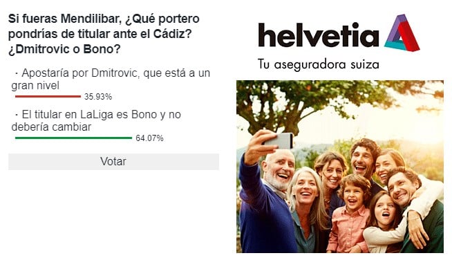 Así, un 64% de los participantes seguiría apostando por Yassine Bono como titular en LaLiga, pues a fin de cuentas ha salvado muchos puntos con sus paradas este año. Sin embargo, un 36% cree que habría que darle la oportunidad a Dmitrovic, que ha demostrado estar a un gran nivel en sus últimos partidos. El sábado saldremos de dudas...