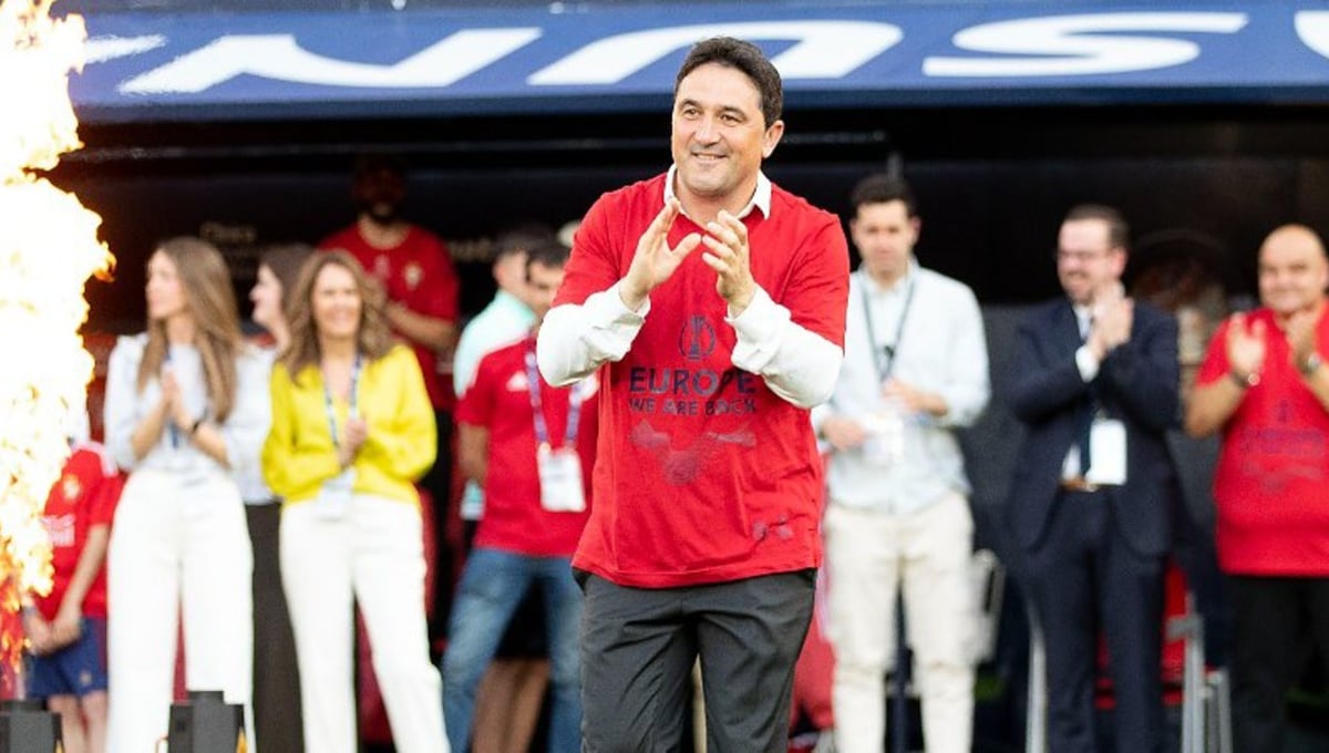 El aún director deportivo de Osasuna celebra la reciente clasificación rojilla para la Conference League.CAO