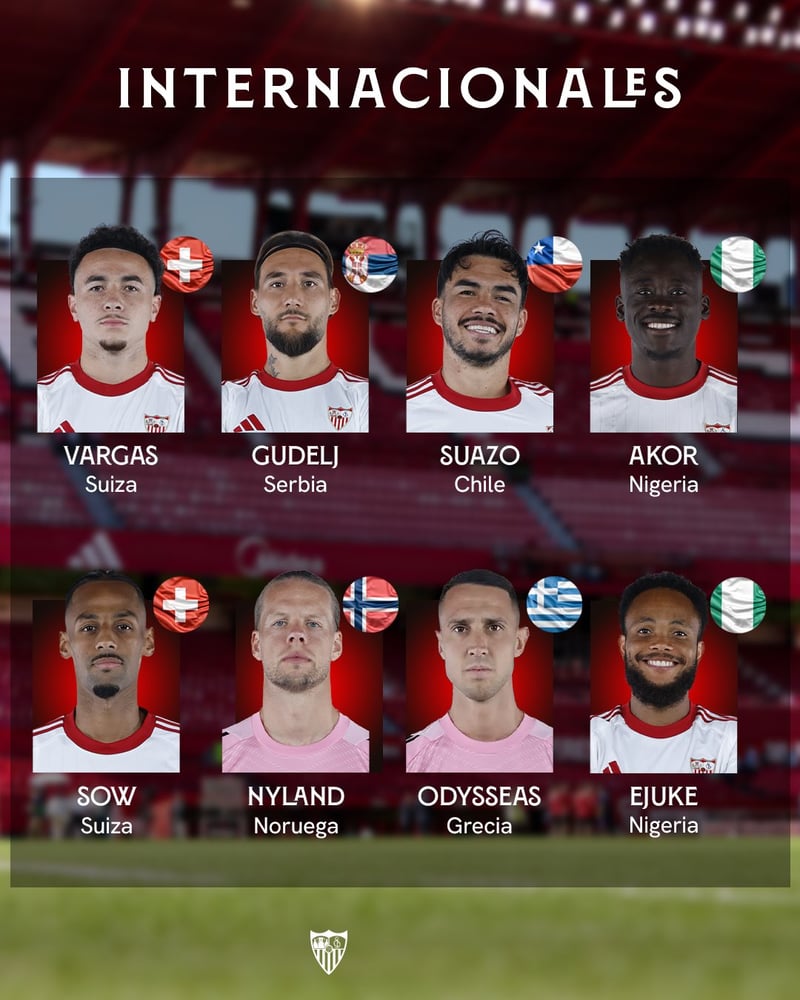 En este sentido, el calendario internacional del Sevilla FC arrancó el jueves 13 de noviembre de la mano de los nigerianos Akor Adams y Chidera Ejuke, así como del noruego Orjan Nyland y el serbio Nemanja Gudelj, quienes también serán los primeros en regresar después de buscar los minutos que no encuentran con Almeyda. El cierre tendrá un triple punto de atención, con compromisos de los suizos Rubén Vargas y Djibril Sow, del griego Odysseas Vlachodimos y del chileno Gabriel Suazo, que esta vez jugará dos amistosos en Rusia (no cruzará el Atlántico pero no se libra de los viajes largos). Ellos serán los últimos en volver.