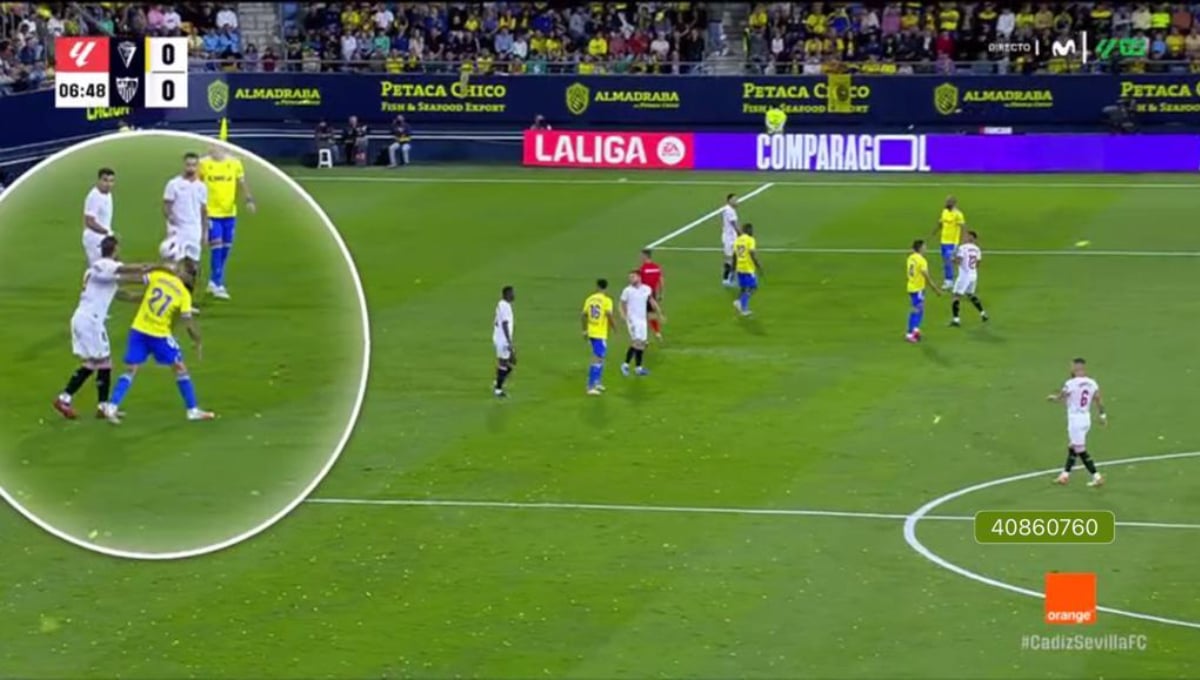 Roger Martí reclamó agresión de Sergio Ramos en esta acción del Cádiz-Sevilla.M+ LaLiga