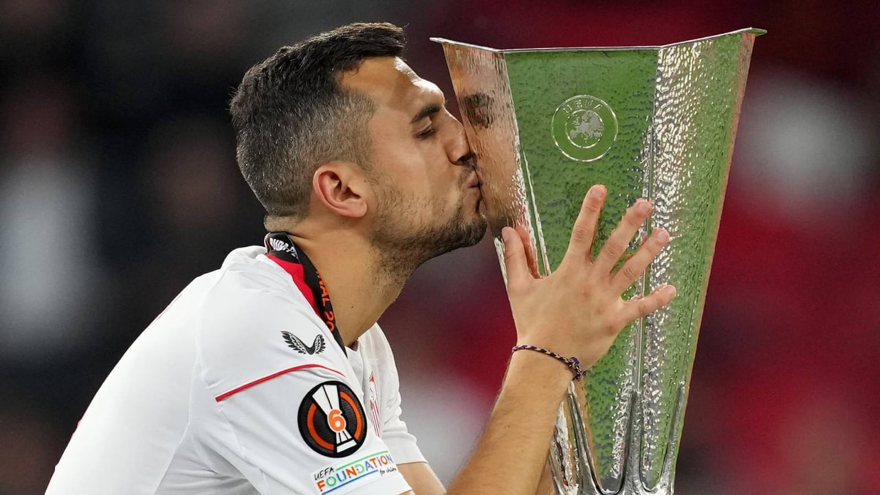 Joan Jordan, besando el título de la UEFA Europa League.Sevilla FC