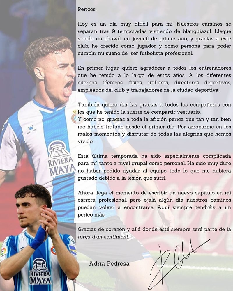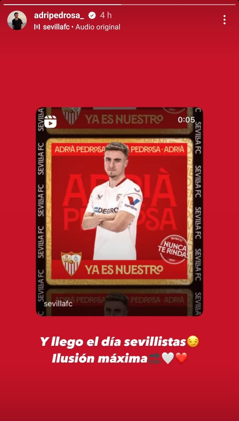 "Y llegó el día. Ilusión máxima, sevillistas". Estas palabras -adornadas con corazones blanquirrojos- han sido las primeras declaraciones de Pedrosa tras la esperada confirmación de su fichaje por el Sevilla FC, noticia con la que vuelve a ver la luz y que le permite abandonar un largo túnel en el que ha estado atrapado durante la práctica totalidad de la temporada 22/23 (sólo jugó 7 partidos, ya en el tramo final de curso). El lateral izquierdo ha sufrido un larguísimo proceso de recuperación de su pubalgia, una fase muy dura en el aspecto anímico en la que, además, sintió que los servicios médicos del RCD Espanyol le hicieron pagar su negativa a renovar.