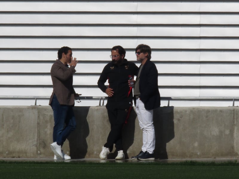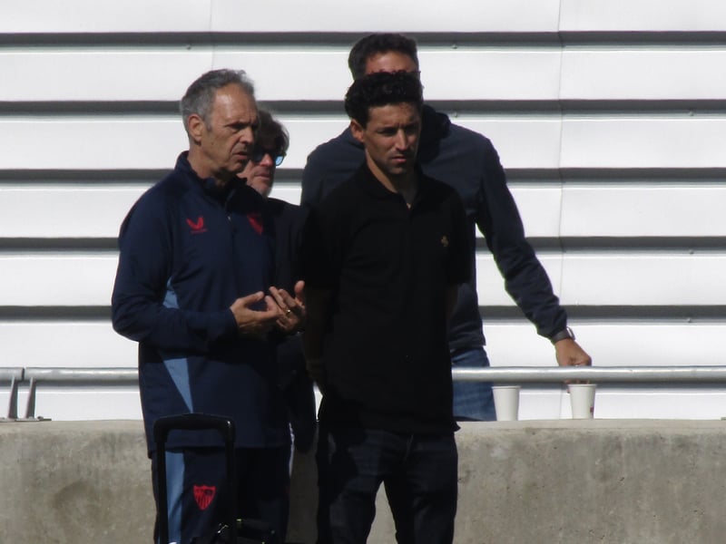 La leyenda sevillista arrima el hombro a sabiendas de la difícil situación por la que atraviesan sus excompañeros. El presidente y el director deportivo sevillista siguieron de cerca la sesión