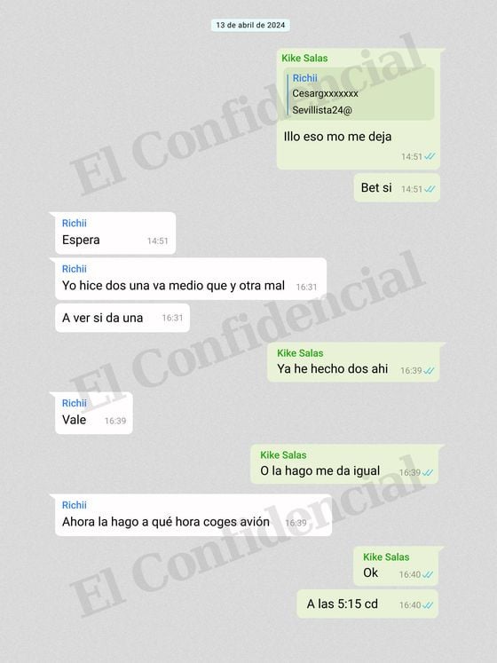 "Illo, ¿no ha llegado dinero del bet? No me corre prisa, pero ya por estar tranquilos de que haya llegado". "Le he metido 50 a Isco; son 300 míos". "¿Sólo deja 150 en el bet?" y, tras la respuesta afirmativa de su amigo, añade "¿Limites? Bueno Betfair es lo mismo, ¿no?". "Ya he hecho dos (apuestas) ahí". Estos son algunos de los mensajes que cita la noticia de El Confidencial y que la Policía ha encontrado en el móvil del central del Sevilla FC. Así, los investigadores concluyen que el futbolista no sólo hacía ingresos a sus amigos para que ellos apostasen, sino que también empleaba cuentas con nombres falsos. Junto a Kike Salas, sus allegados César G. -alias Richi- y Kevin L. también fueron arrestados. A los tres se les imputa un delito de estafa tras saltar la alarma de la empresa Codere por una sospechosa apuesta a que vería amarilla en un partido ante el Barcelona y así fue. "Se pudo determinar la existencia de vínculos de amistad entre el jugador", explica la Policía en un informe.