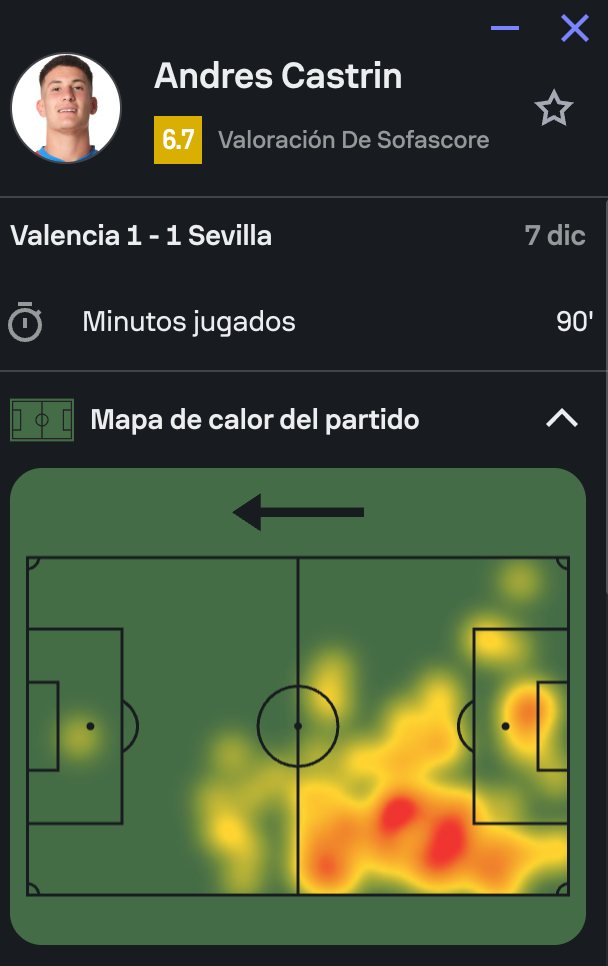 "Fue un palo duro al final del partido. Hicimos un encuentro muy completo a nivel general todos los compañeros. Creo que fue uno de los mejores partidos a nivel táctico y grupal. Son detalles finales los que marcan la diferencia", aseguraba en la zona mixta de Mestalla un Andrés Castrín que fue, sin duda, de los mejores en blanquirrojo este domingo. Con una pléyade de bajas, podría seguir jugando. Formó el gallego en el vértice izquierdo de una defensa de tres centrales, con César Azpilicueta y Nemanja Gudelj más a su derecha, aportando oficio y experiencia, aunque el '32' brilló por encima del navarro y del serbio: tres intercepciones, nueve despejes, dos tiros bloqueados, siete recuperaciones y sólo dos faltas, ganando cuatro de sus ocho duelos por abajo, con un 81% de acierto en el pase además.