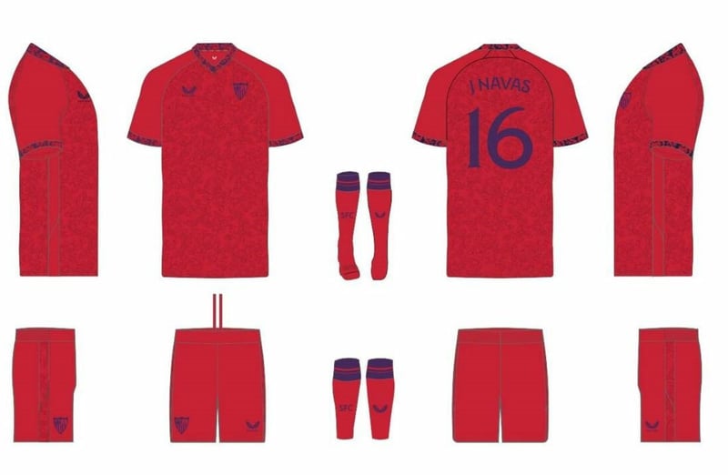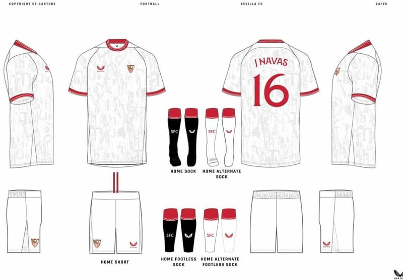 Como se conoció gracias a los 'leaks' de la conocida página especializada en camisetas @FootyHeadlines, apenas habrá variaciones con Castore en este tercer ejercicio de vinculación con los del Ramón Sánchez-Pizjuán, ya que la política de los últimos años es conservar una vestimenta titular eminentemente blanca y con detalles rojos, con calzonas blancas y medias del mismo color y con vuelta roja. La novedad, aparte de la posibilidad de unas calcetas negras con remate rojo en determinados encuentros, reside en que las tres equipaciones incorporan una trama de fondo que va variando la tonalidad y que, con carácter desigual, 'mancha'. En la primera, el 'template' se antoja grisáceo, mientras que en la segunda parece a medio camino entre el rosa y el morado. Como de costumbre, la alternativa será roja, pero en una gama distinta a la de este curso, más cerca del carmesí, sin llegar al carmín. Las medias y el pantalón, idénticos. El escudo, el logo de la firma inglesa y los dorsales y nombres, violáceos.