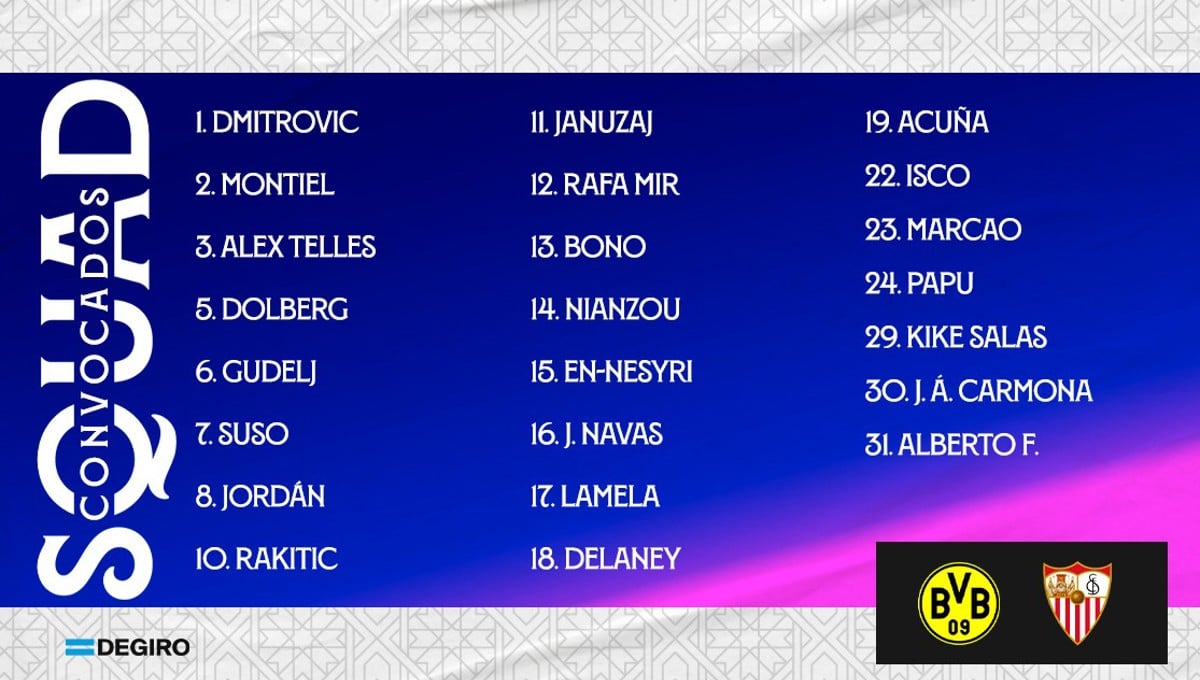 Ésta es la convocatoria del Sevilla FC para Dortmund: : Dmitrovic, Bono, Alberto Flores, Jesús Navas, Montiel, Marcao, José Ángel, Nianzou, Kike Salas, Acuña, Telles, Gudelj, Rakitic, Delaney, Jordán, Papu Gómez, Isco, Suso, Januzaj, Erik Lamela, En-Nesyri, Dolberg y Rafa Mir.