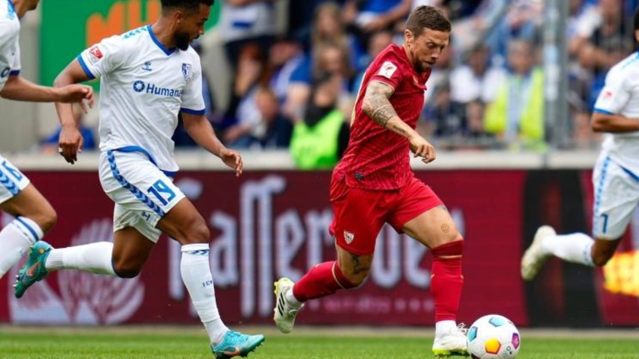 Papu Gómez conduce el esférico en el último amistoso, frente al Magdeburg.Imagen Sevilla FC