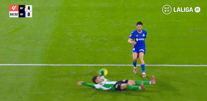 "Seguimos en el Estadio de La Cartuja, justo tras el córner anterior. Un atacante del Getafe, presionado por varios defensores del Betis, conduce el balón desde dentro del área hacia afuera y es derribado al límite de la frontal. El árbitro señala falta fuera del área, en primera instancia. El VAR, al revisar las imágenes, le comunica que el contacto que produce la falta acontece en la pierna izquierda del jugador del Getafe, que aún se encuentra dentro del área, por lo que, como se establece en la Regla 14, se debe señalar penalti. El CTA considera correcta la intervención del VAR y el cambio de decisión del árbitro. Al tratarse de una cuestión meramente geográfica, no es necesario acudir al monitor, lo que agiliza el procedimiento y garantiza la aplicación precisa del reglamento", sentencia sobre un hipotético toque de Giovani Lo Celso a Dakonam Djené que no muestra claramente ninguna repetición y que, en realidad, parece más un tropiezo con su propio pie de apoyo del defensor visitante.
