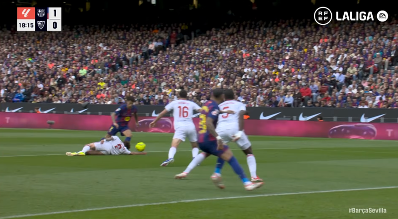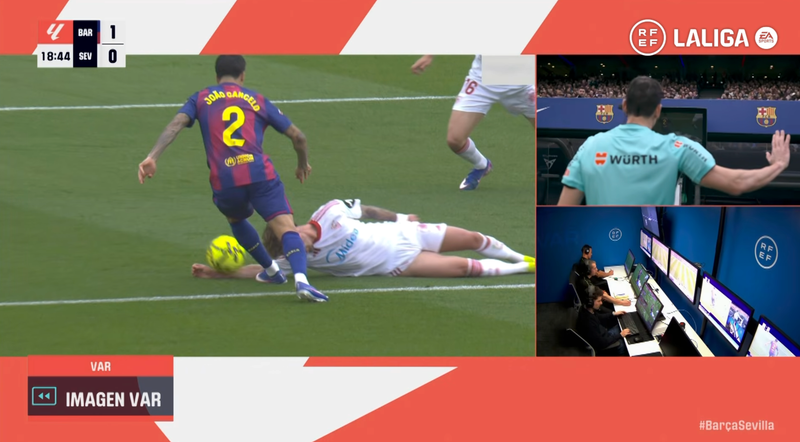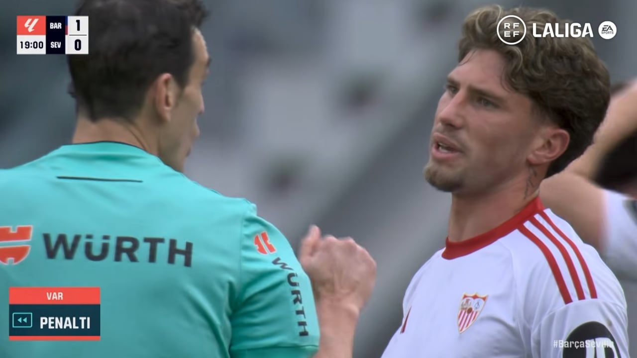 "En esta acción, un atacante del Barcelona encara a un defensa sevillista que está tirado en el suelo. Al avanzar el balón, éste golpea en el brazo estirado el defensor sevillista. El árbitro deja seguir, pero el VAR, tras analizar la jugada, recomienda al árbitro su revisión por considerar que el brazo está en posición antinatural y ocupando espacio indebido. El árbitro, tras detener el juego en espacio neutral, acude al monitor y, viendo la toma que le muestran desde la sala VOR, señala penalti", desgrana la otrora colegiada aragonesa, mientras se emiten diferentes repeticiones de la controvertida acción.