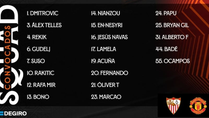 La lista de convocados del Sevilla FC ante el Manchester United está formada por Yassine Bono, Dmitrovic, Alberto Flores, Jesús Navas, Badé, Marcao, Nianzou, Rekik, Acuña, Alex Telles, Fernando Reges, Gudelj, Óliver Torres, Bryan Gil, Lucas Ocampos, Erik Lamela, Rakitic, Suso, Papu Gómez, Rafa Mir y En-Nesyri.