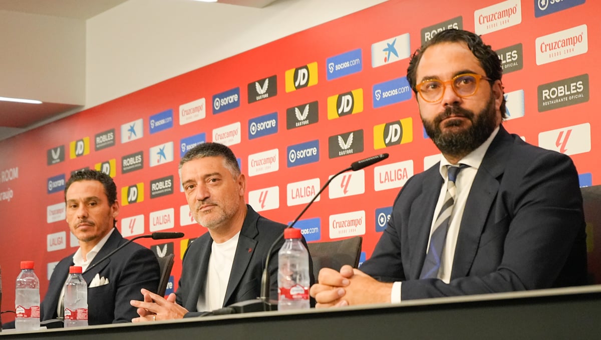 Un momento de la presentación del catalán como nuevo entrenador sevillista en junio de 2024.Lince