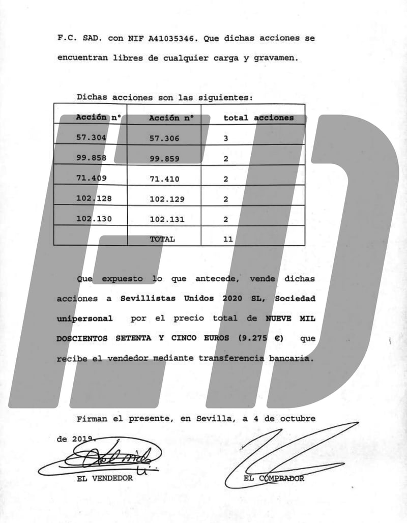 La redacción de ESTADIO Deportivo ha tenido acceso a la escritura de compraventa de un paquete accionarial del actual presidente del Sevilla FC a los americanos en 2019, cuando estos arribaban para hacerse con el club