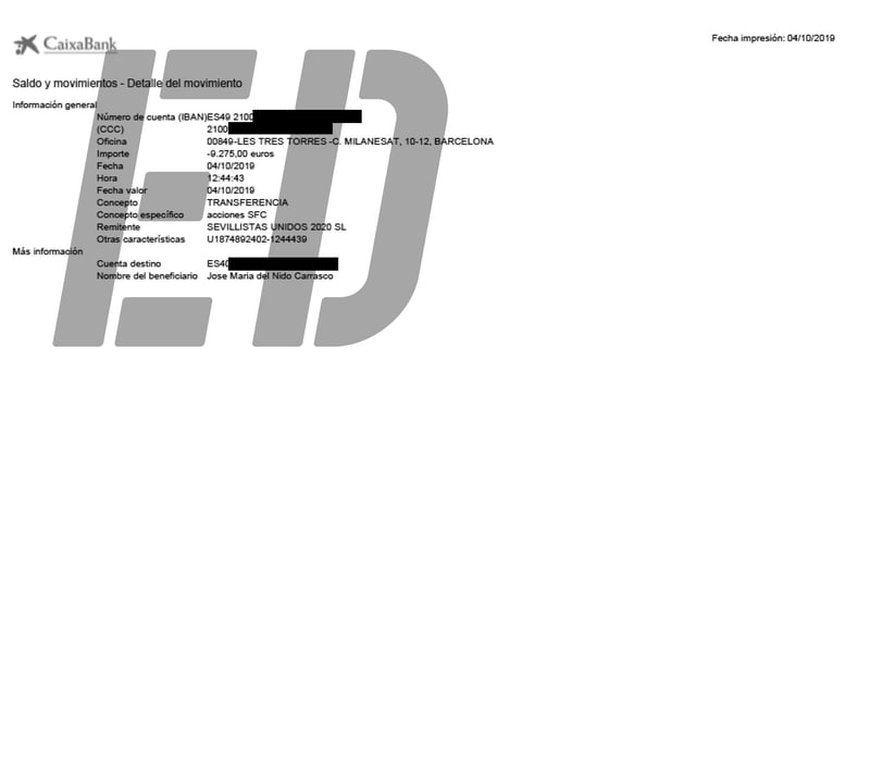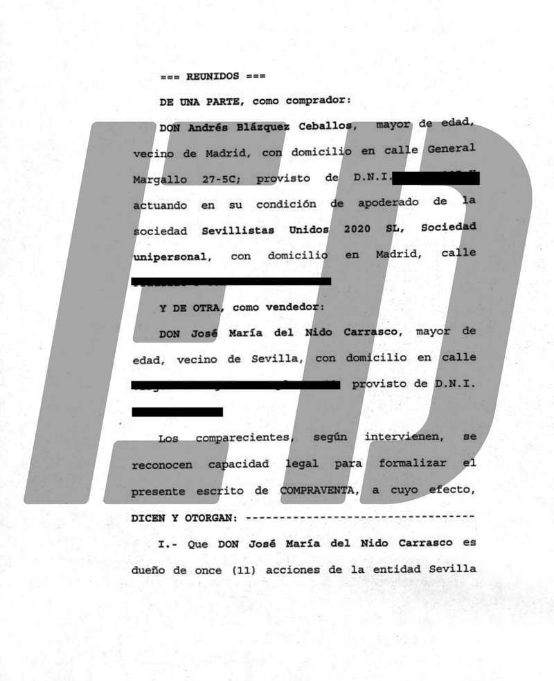 Mucho más novedoso, en cambio, resulta la información a la que ha tenido acceso ESTADIO Deportivo. Y es que el expresidente Castro no fue el único que vendió acciones a los americanos en su momento, habiéndolo hecho también el actual presidente del Sevilla FC, José María del Nido Carrasco. Así lo atesora la escritura de compraventa a la que ha tenido acceso este diario, siendo comprador Andrés Blázquez, como representante de Sevillistas Unidos 2020, y vendedor José María del Nido Carrasco. Un paquete de once acciones del Sevilla FC por el que en octubre de 2019 alcanzaron un acuerdo por un importe total de 9.275 euros. El precio, bastante inferior al que podría alcanzar hoy día, pudiendo triplicar su valor.