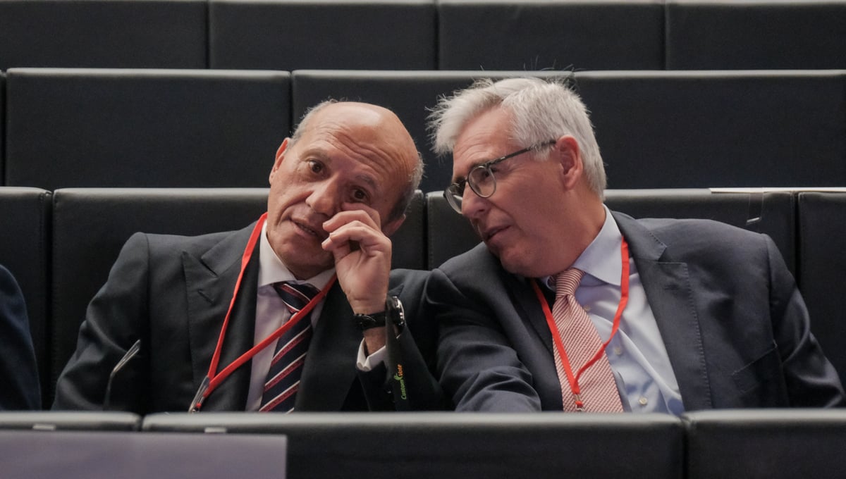 El ex presidente blanquirrojo dialoga con su abogado, José Manuel García-Quílez Gómez, durante la última junta.Lince