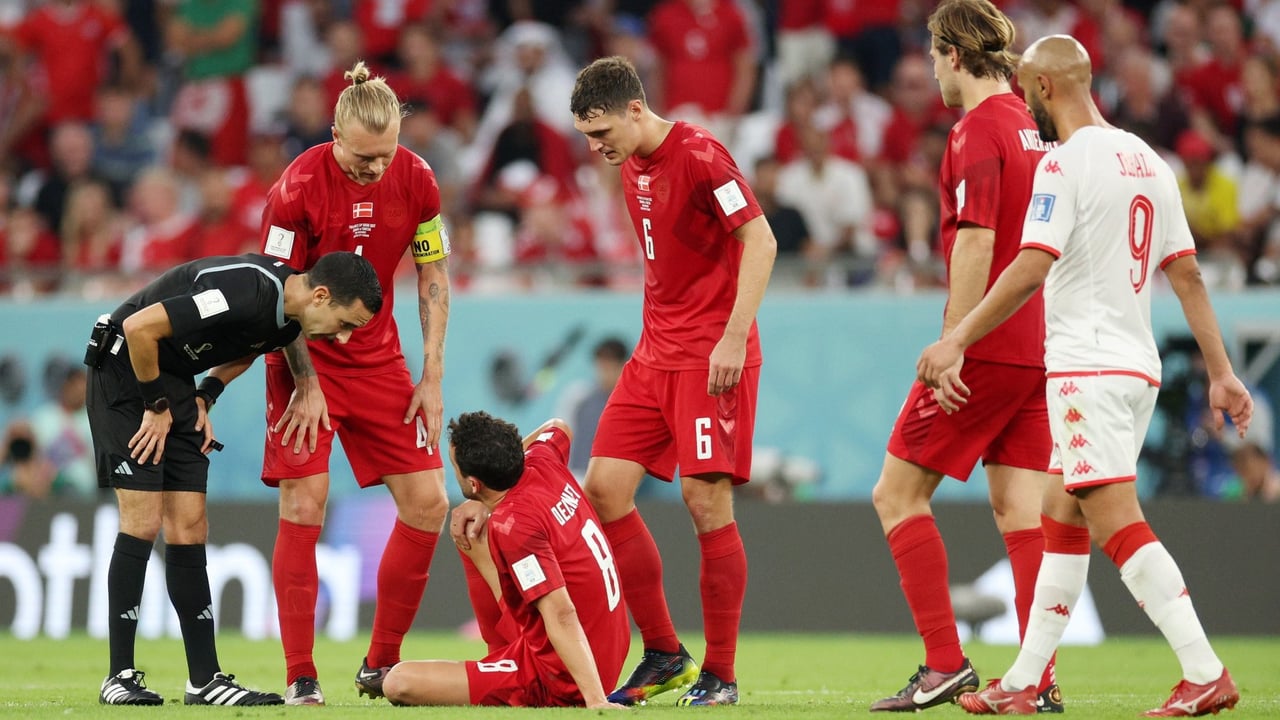 Thomas Delaney indica al colegiado del Dinamarca-Túnez que tiene que retirarse.FIFA